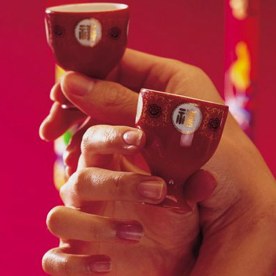 取2个一样的杯子,分别倒满酒,在其中一个杯子口部盖上保鲜膜,然后将2个杯子口对口的扣上,缓缓抽出薄膜,要求新人不能动手,一起喝完扣在一起的两杯酒,不能洒出。